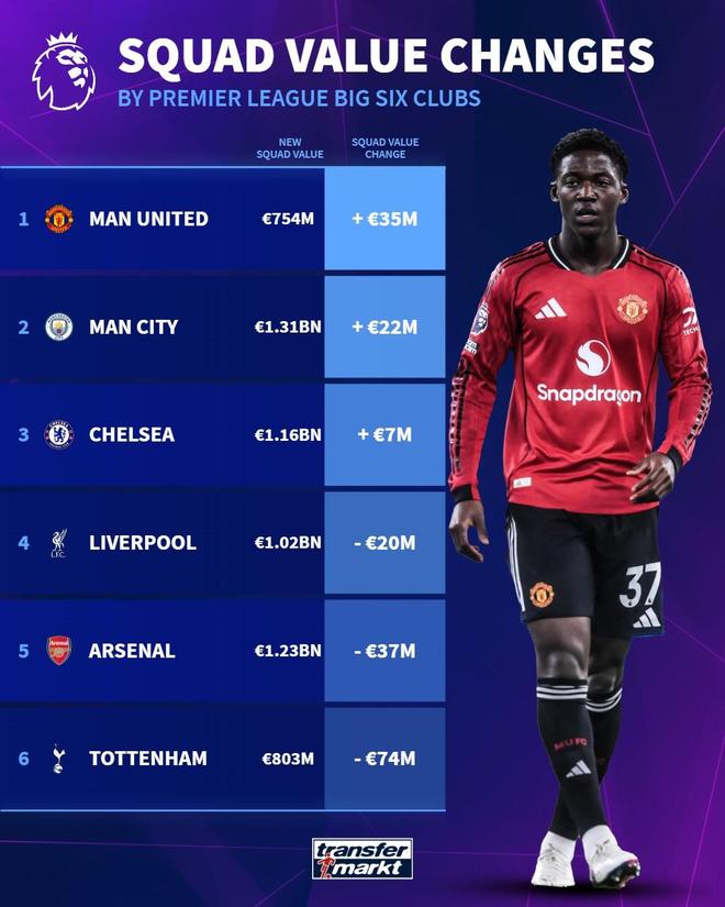 英超BIG6球队身价变化:曼联上涨3500万欧,热刺暴跌7400万欧